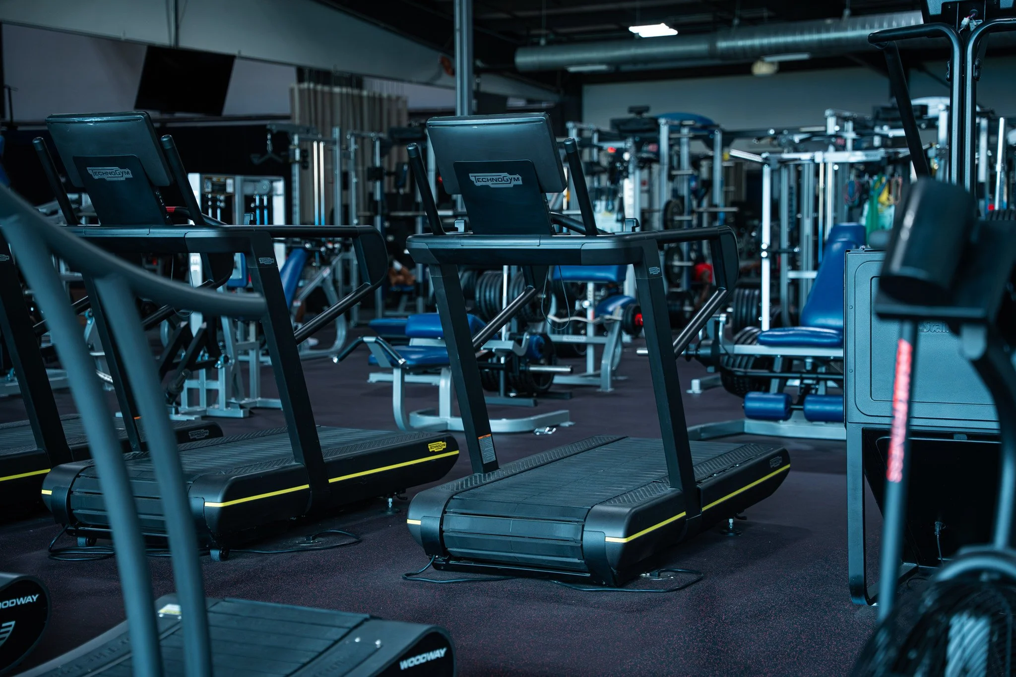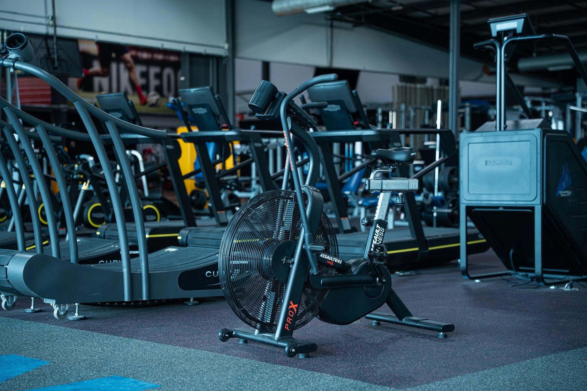 Indoor gym with exercise equipment, including an upright stationary bike with a fan at the front, treadmills, and other workout machines.