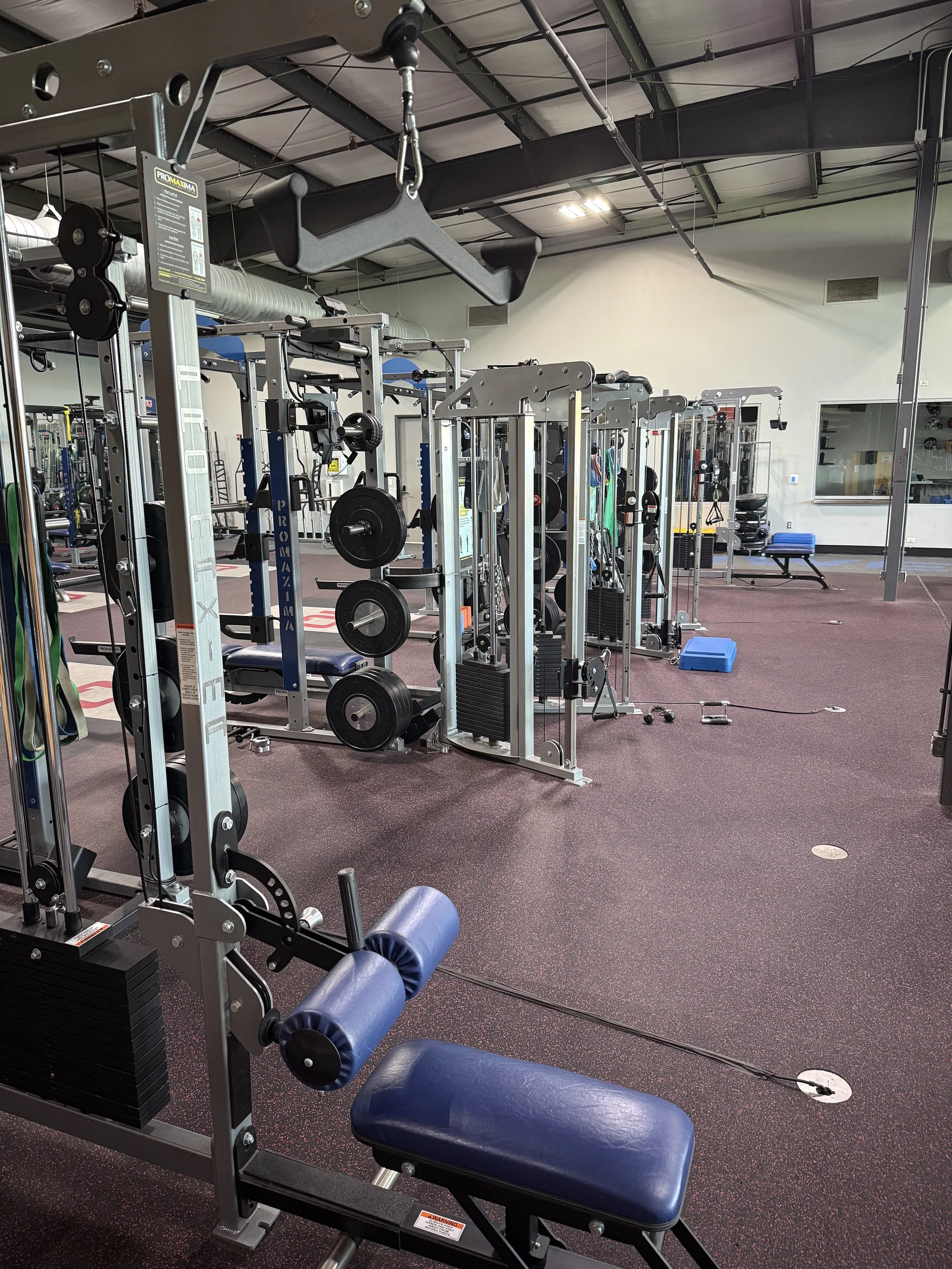 Interior of a gym with various workout equipment, including weights, machines, and benches, on a maroon rubberized floor.
