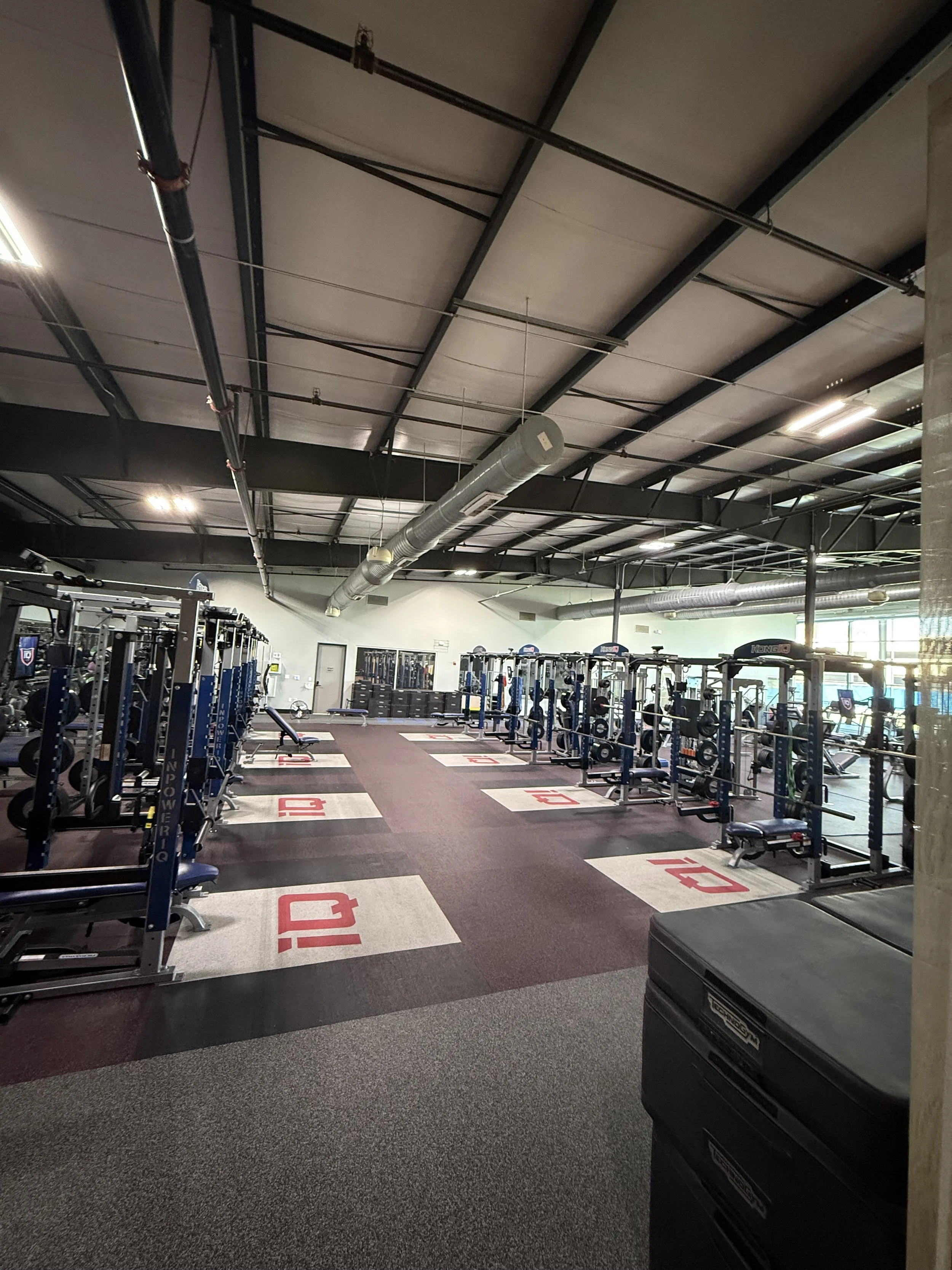 Empty gym with weightlifting equipment and numbered workout stations, industrial ceiling, and natural light coming through windows.