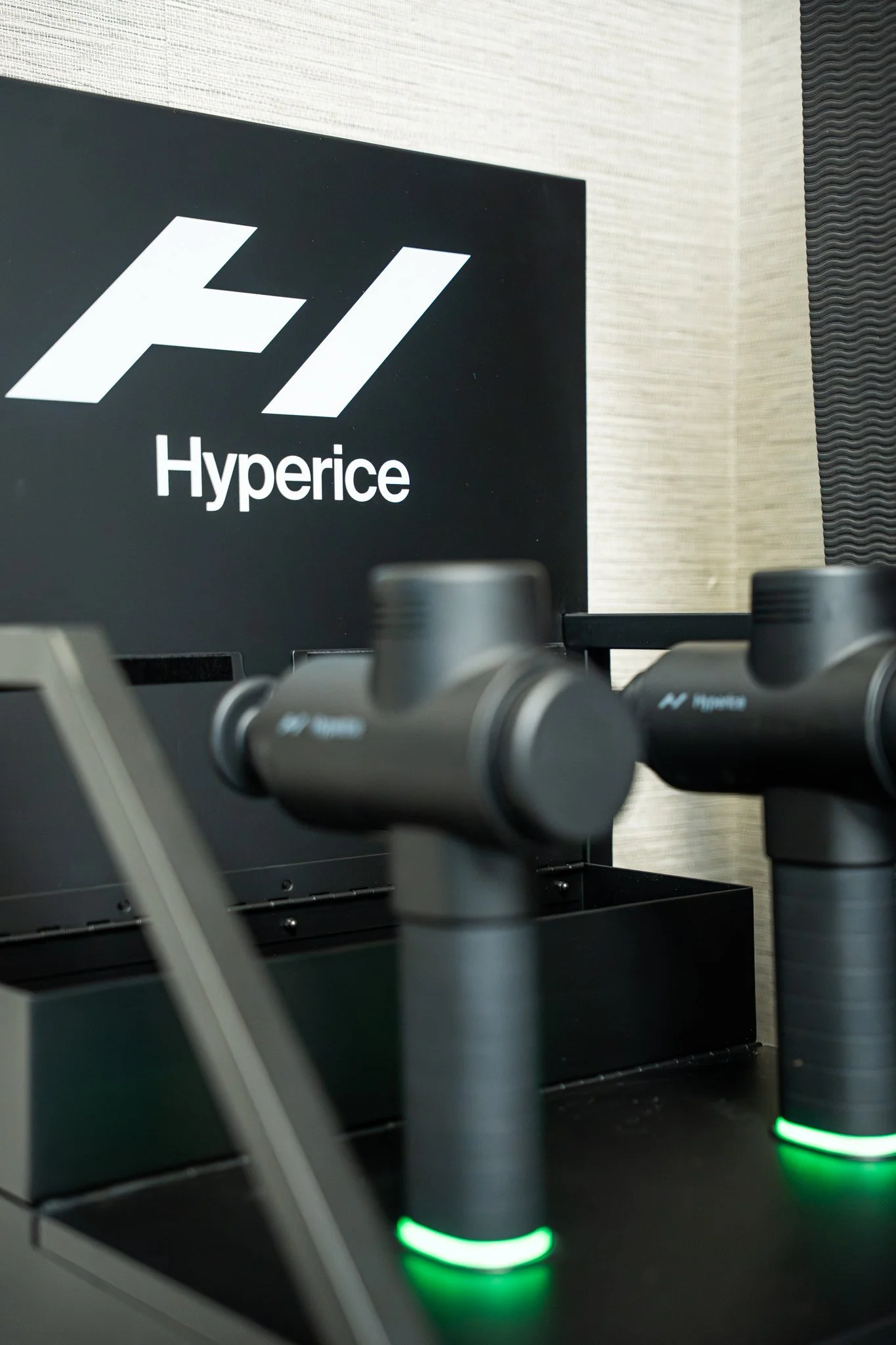 Hyperice massage devices in front of a Hyperice sign in a modern room.