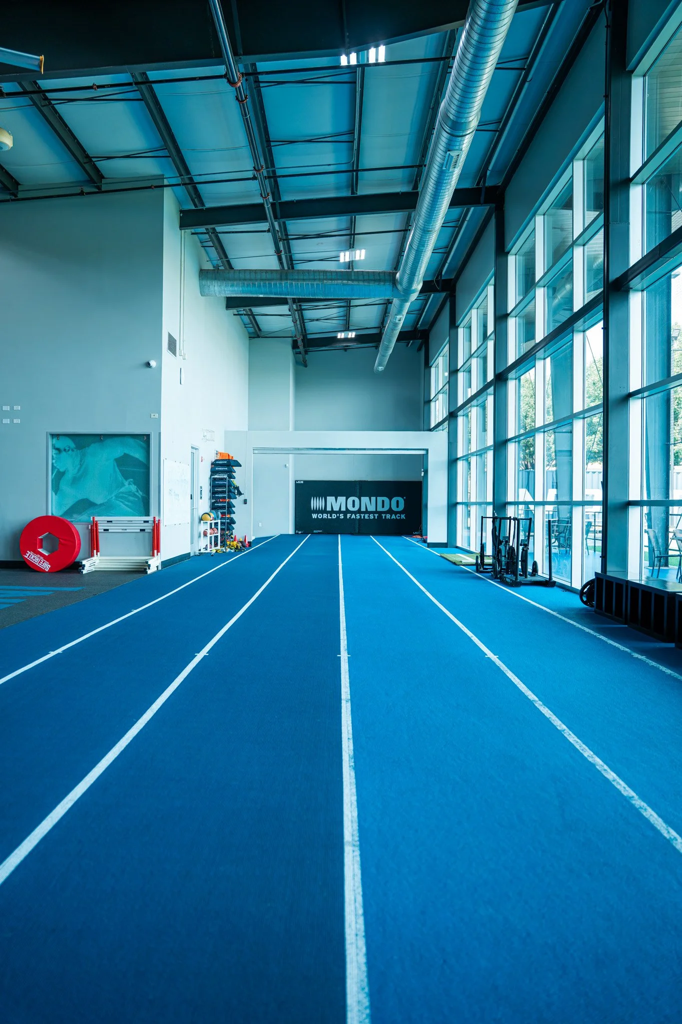 Indoor running track in a sports facility, with large windows on one side and exercise equipment in the background.