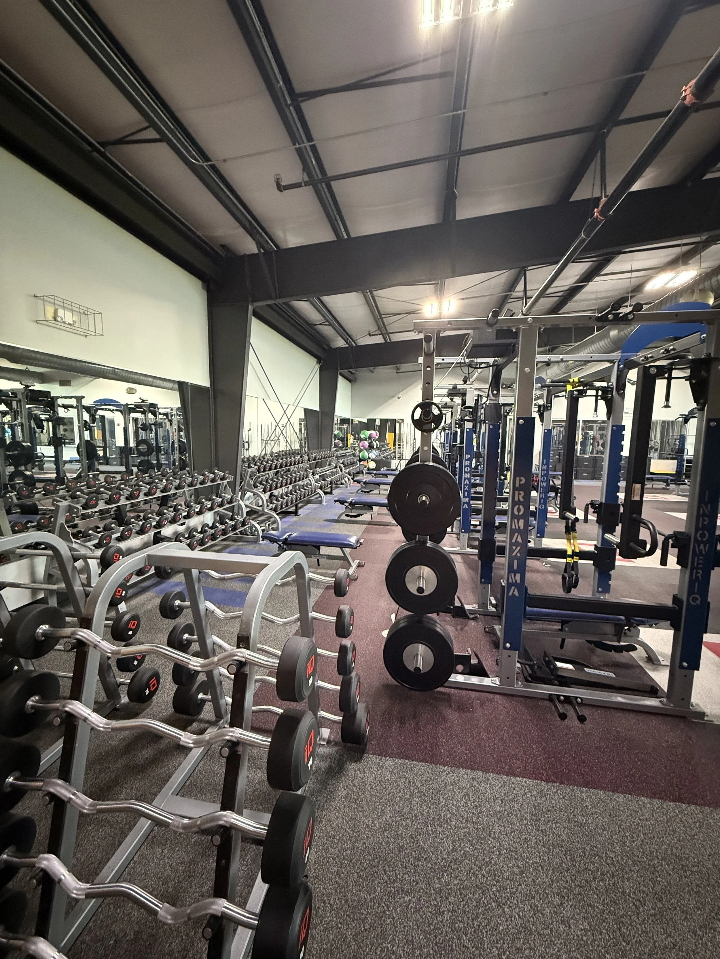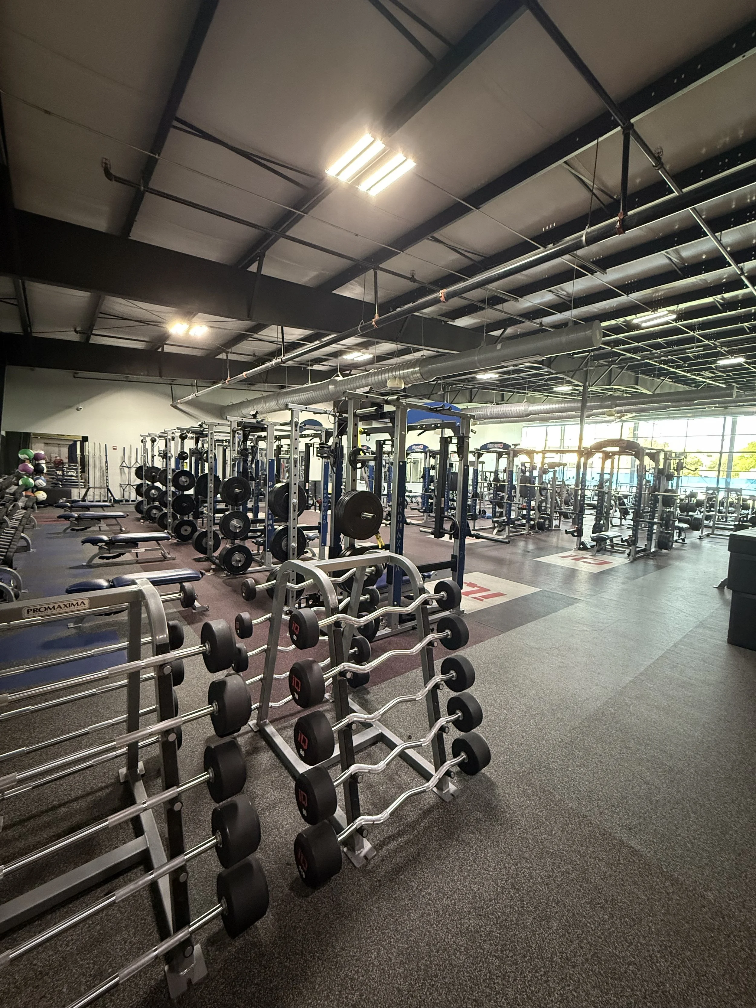 Indoor gym with various dumbbells, weightlifting equipment, and resistance machines.