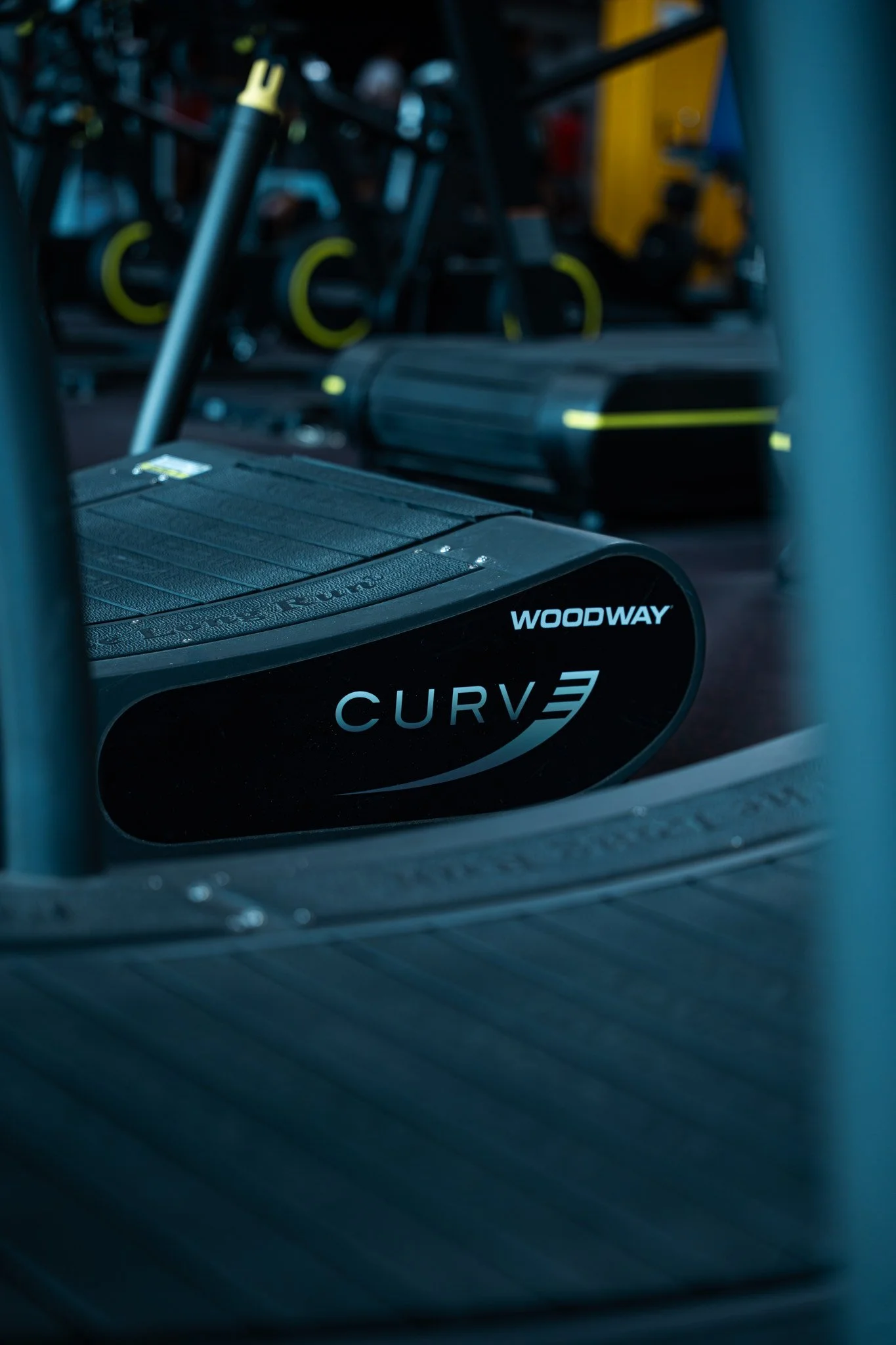 Close-up of a Woodway Curv treadmill in a gym, with other gym equipment blurred in the background.