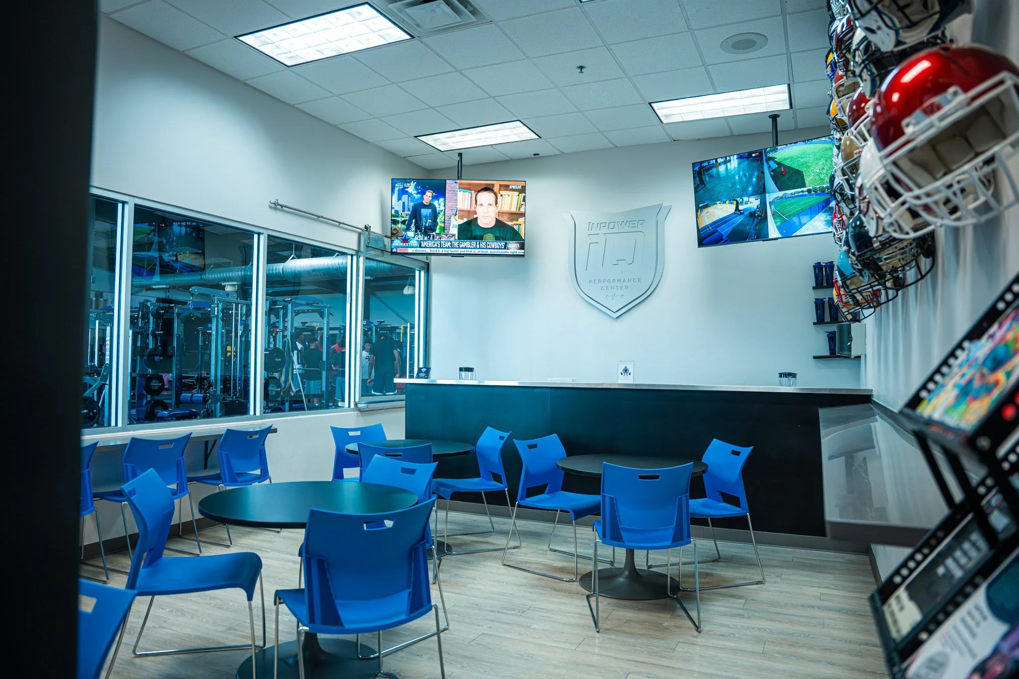 Empty seating area with blue chairs and tables inside a performance center, with a view into a gym through glass windows on the left, sports helmets on the right wall, and multiple TV screens showing news and sports coverage on the wall.